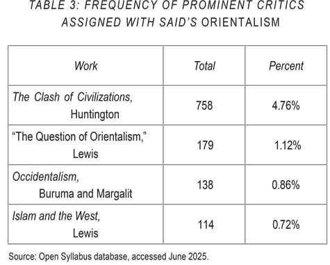If we expand our review from these titles to the top 100 works assigned with Orientalism, it doesn't reveal many critics. One is the aforementioned Clash of Civilizations. It is assigned in 758 courses along with Said's book, a bit less than 5% of the time (see Table 3 below).