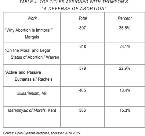 What gets assigned with Thomson's essay? To the credit of many professors, the most commonly assigned text is "Why Abortion Is Immoral" by Don Marquis, a pro-life philosopher. As noted in Table 4 below, Marquis appeared with Thomson in more than a third of the syllabi in which her essay was taught. Though not a direct critique of Thomson, Marquis did at least present a case against abortion rights. After Marquis, the most commonly assigned texts included one by the pro-choice philosopher Mary Anne Warren as well as broader works in bioethics and philosophy.