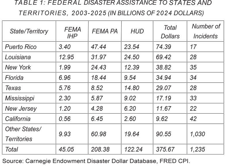 The table below provides a detailed breakdown of federal disaster-relief spending by program from 2003 to 2025; it shows the variable extent of implicit federal-catastrophe insurance, both geographically and in dollar terms.