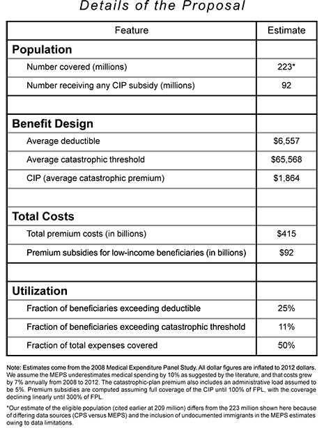 The approach to health insurance described here would have several important advantages over both the health-care system we have long had in America and the reforms sought by the Affordable Care Act. This proposal would eliminate the risk of catastrophic financial loss as a result of health crises for all citizens and legal residents. The recent health-care reform law, meanwhile, would leave well over 20 million citizens and legal residents uninsured. The incremental annual funding needed for this proposal — about $92 billion — would be significantly less than the projected cost of the Affordable Care Act's coverage provisions, and could be largely or entirely paid for by the savings made possible by the proposal itself.
